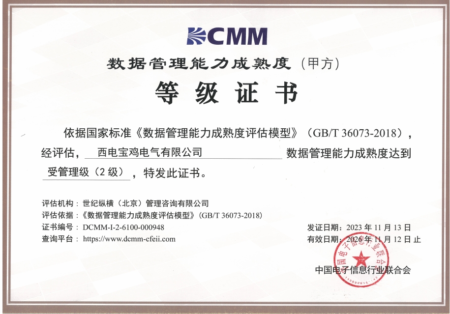 近日,中國(guó)電子行業(yè)信息聯(lián)合會(huì)頒發(fā)了西電寶雞電氣數(shù)據(jù)管理能力成熟度(受管理級(jí)2級(jí))證書(shū),這是西電寶雞電氣繼8月份獲得陜西省工信廳“2023年DCMM貫標(biāo)試點(diǎn)企業(yè)”后,在數(shù)據(jù)管理方面取得的又一重要榮譽(yù),標(biāo)志著西電寶雞電氣數(shù)據(jù)管理邁上新的臺(tái)階。