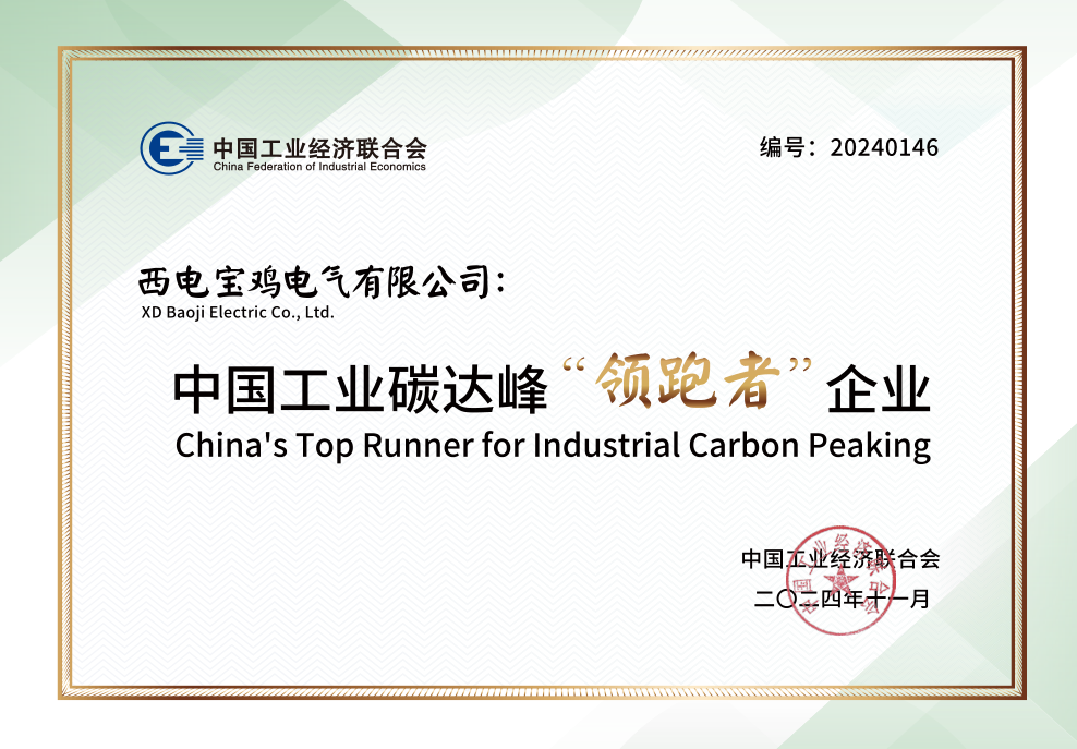 日前,西電寶雞電氣在江蘇蘇州舉辦的中國工業(yè)經(jīng)濟聯(lián)合會第三屆中國工業(yè)碳達峰論壇上榮獲2024年中國工業(yè)碳達峰“領跑者”企業(yè)稱號。這是公司繼2023年榮獲國家級綠色工廠后,在綠色低碳發(fā)展方面取得的又一重要成績。